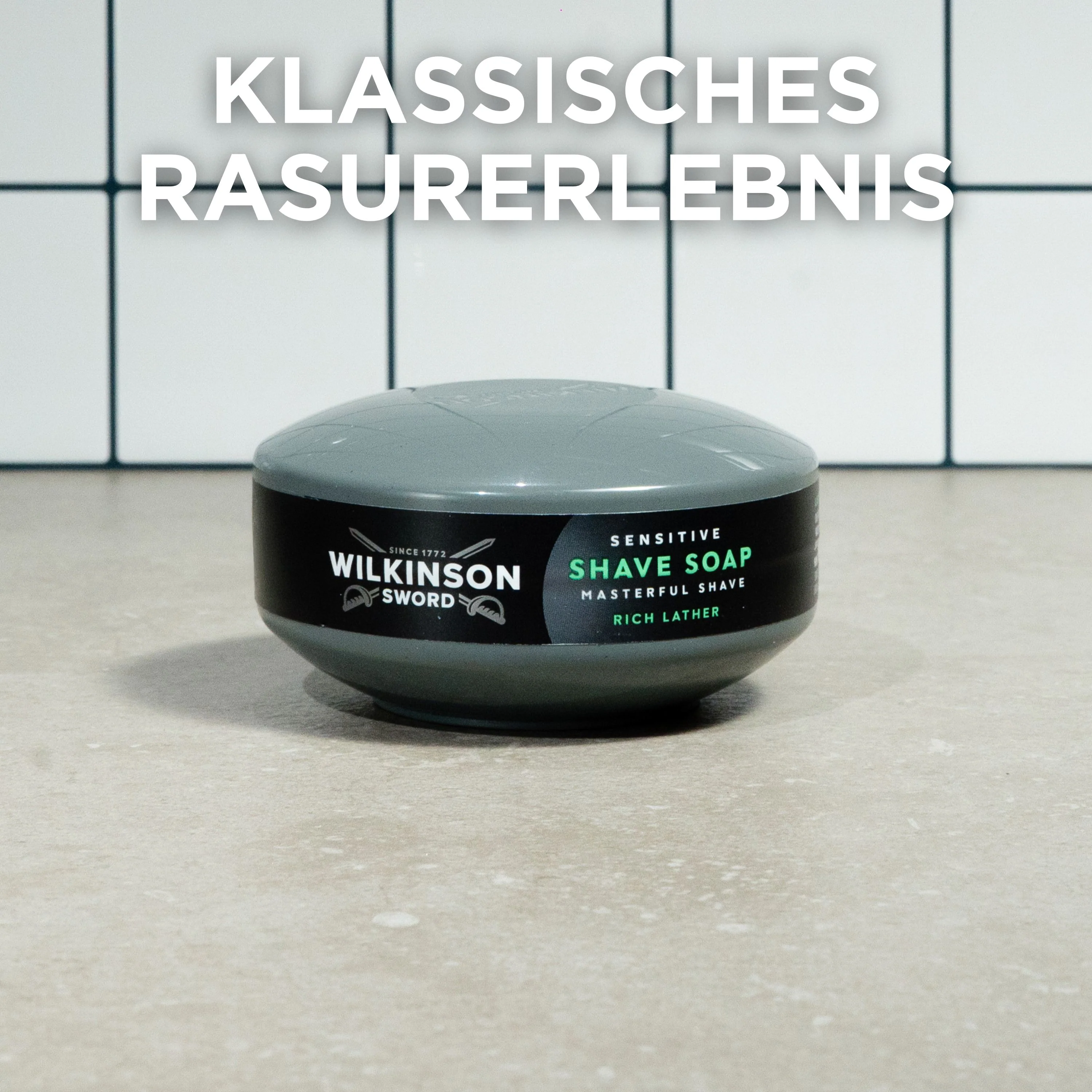 Erlebe eine meisterhaft gründliche Rasur mit der sensitiven Rasierseife von Wilkinson Sword. Unsere Rasierseife hat eine angenehm cremige Formulierung für ein geschmeidiges Hautgefühl und ist die ideale Vorbereitung für ein klassisches Rasurerlebnis. Mit dem Rasierpinsel von Wilkinson Sword wird die Rasierseife zu einem reichhaltigen Schaum aufgeschäumt und aufgetragen. So gleitet die Klinge leichter über die Haut und Irritationen bei der Rasur werden minimiert – für eine sanfte und glatte Rasur. Die dermatologisch getestete Rasierseife besteht zu 89% aus natürlichen Inhaltsstoffen* und ist für empfindliche Haut geeignet. Bei Wilkinson Sword steht Qualität an erster Stelle. Entdecke mit der in Europa hergestellten Rasierseife Sensitive eine neue Dimension der gründlichen Rasur. Wilkinson Sword – Blade Masters since 1772. *Enthalten >50% Material aus natürlichen Quellen; Berechnung beinhaltet 65,77% Rezepturwasser.“